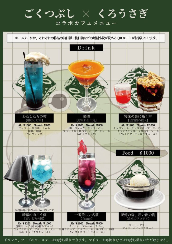 ごくつぶしコラボカフェ(3/2~4/29) 2026年4月14日 最終更新日時 : 2026年4月14日 kurousagi コースターには、それぞれの作品の前日譚・後日談などの短編小説が読めるQRコードが付属しています。